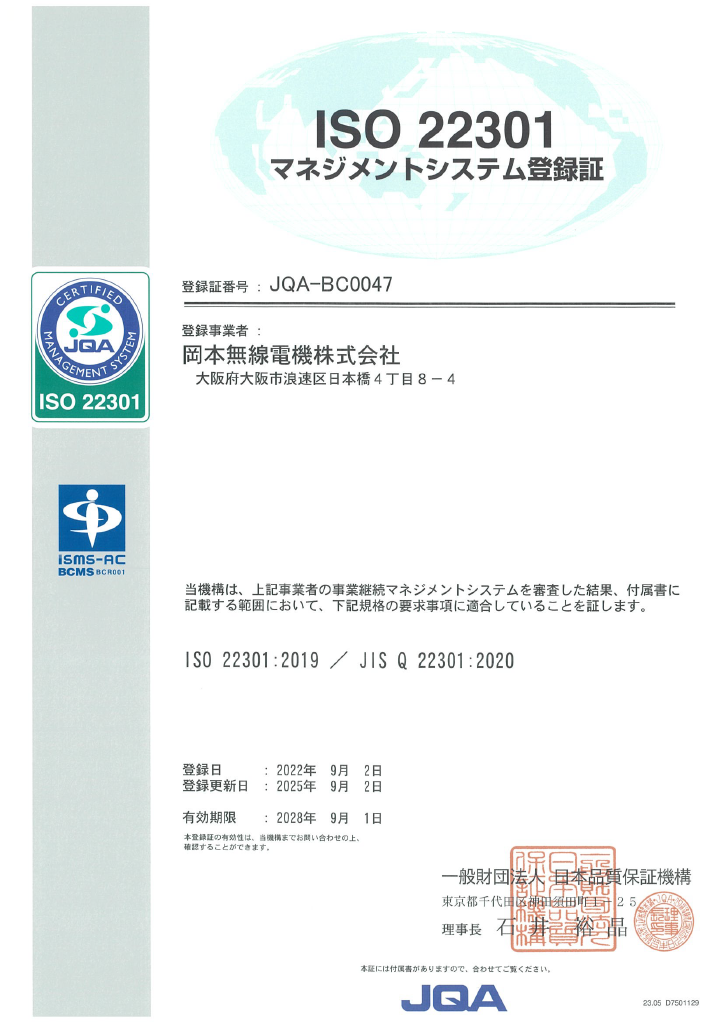 岡本無線電機株式会社およびおおとり株式会社は、電子部品・半導体・制御部品・測定器・工具 他の販売を主な事業としており、これらの事業が中断した場合、当社取扱製品を用いるお得意先様およびお取引先様に多大な影響を与え、ご迷惑をおかけすることが予想されるため、当社の事業を中断させる様々な脅威への対応として、本方針に基づく事業継続計画を策定し、社内外の環境変化に応じた継続的改善を行っていくことを宣言します。